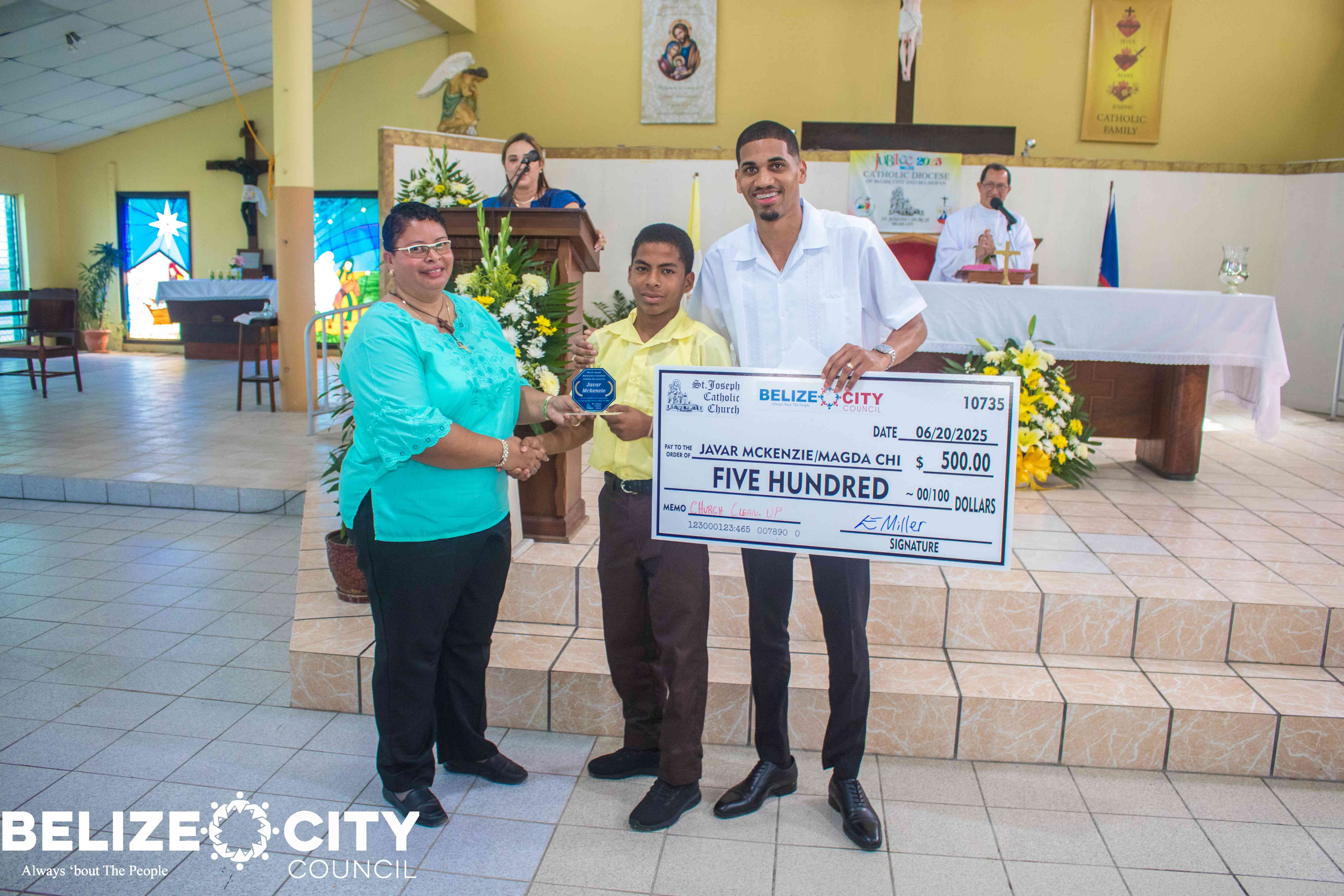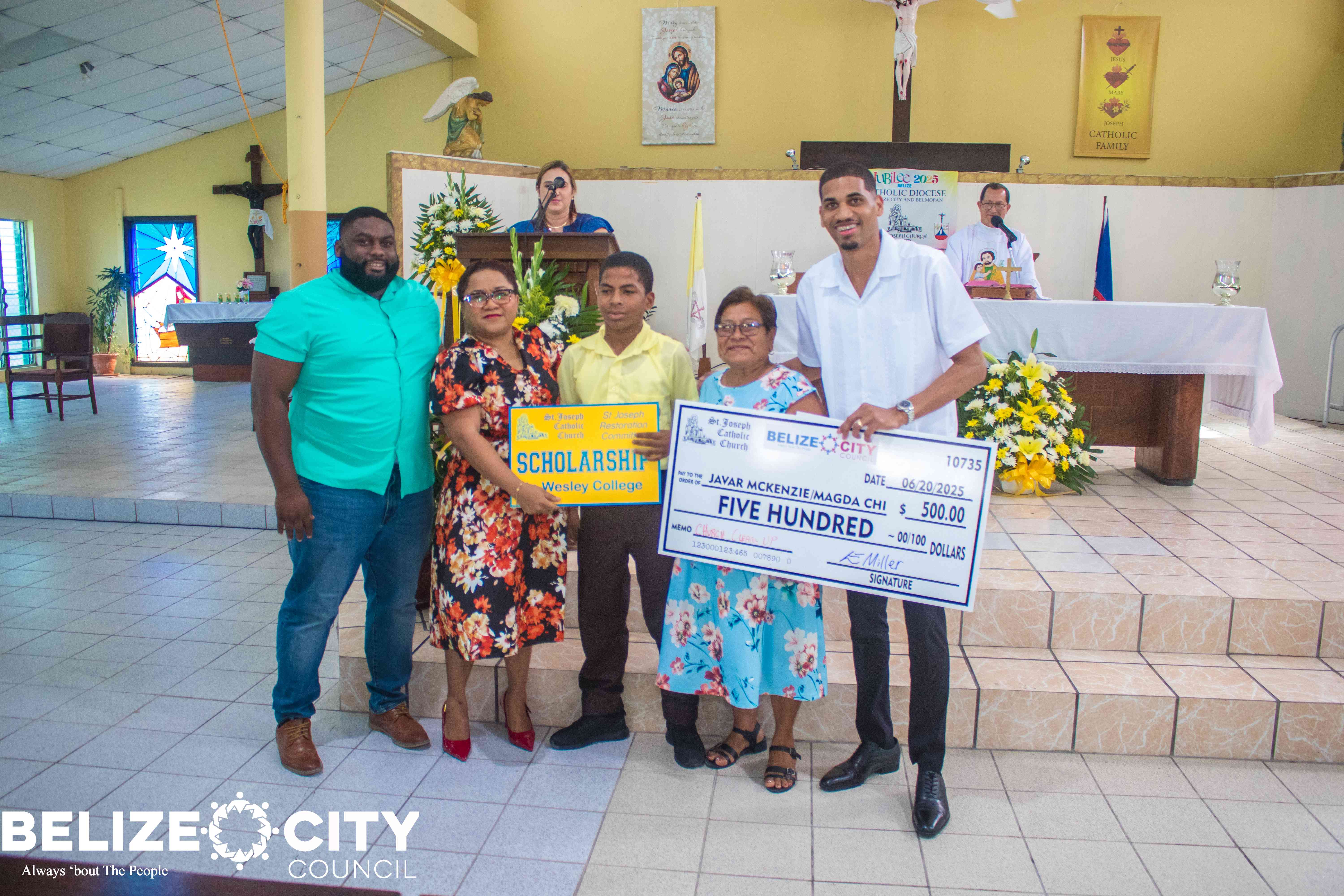 Javar McKenzie, the only Standard Six student who participated in the St. Joseph Church clean-up campaign held last month, was honored for his strong spirit of community service. In recognition of his efforts, he received a full scholarship from St. Joseph Catholic Church. Additionally, the Belize City Council awarded him a $500 donation to assist with the purchase of high school books as he prepares to begin his academic journey at Wesley College.