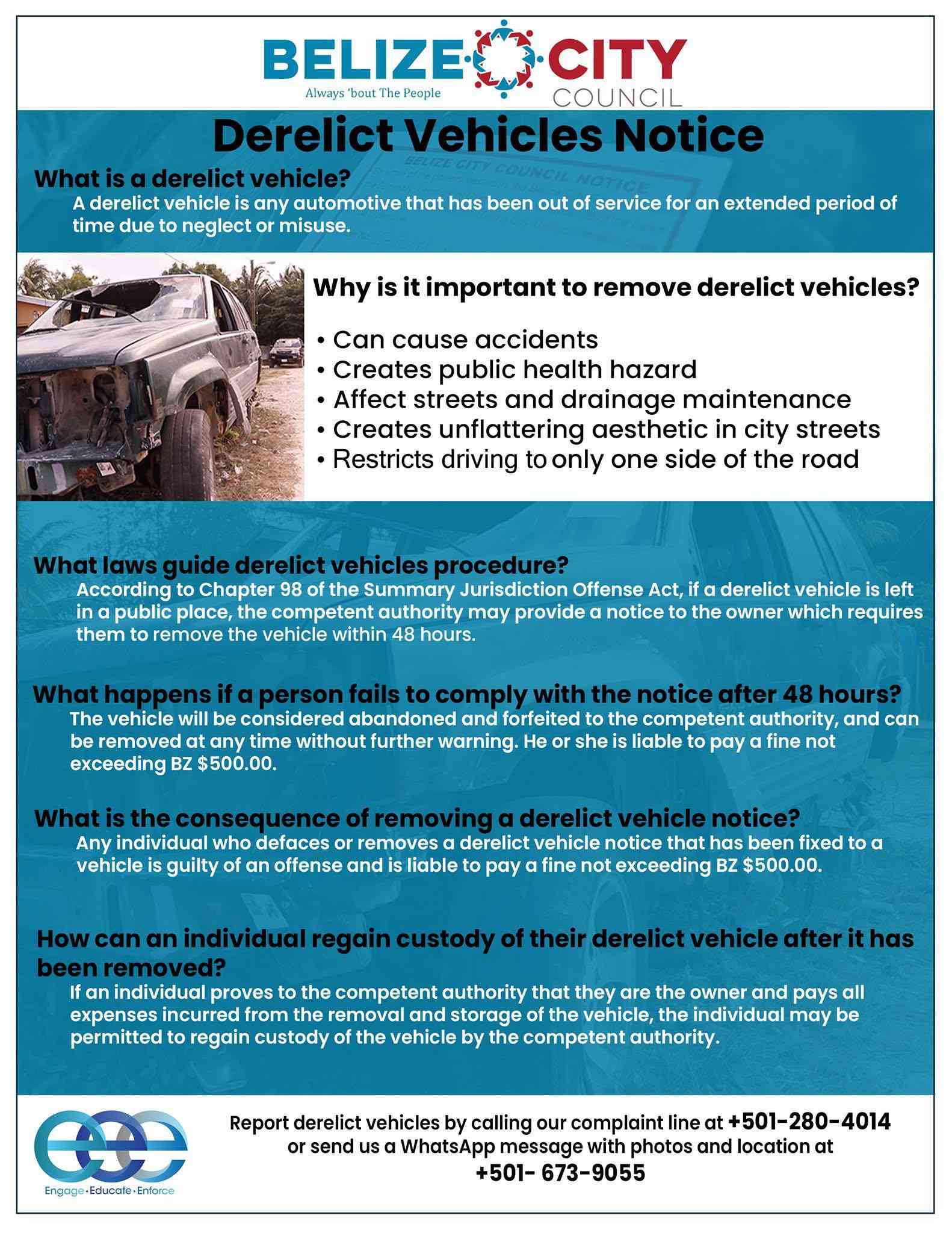 The Belize City Council, through our Public Health and Traffic Enforcement Units, in partnership with the Belize Police Department, continues its efforts to remove derelict vehicles from our streets. 🚛🚓
